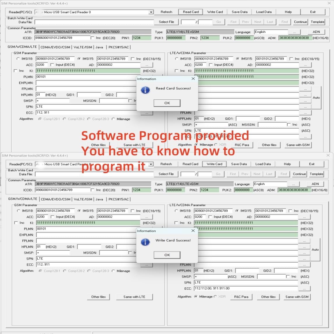 Pls kindly Note: This card use for testing project, Please use this card professionally. , Please make sure you have knowledga about sim card, if you don't know program, We don't suggest you order it one more things, backup sim card does not mean "read then write", it can not read protect data directly, like "KI". please be professional make sure you have enough technology. Our device is a reader writer , It support 1) SIM ( 2G/ 3G/4G) 2) Smart Card(SLE4442 ,SLE4428, SLE5528, SLE5542, AT24C02/16/64 , AT88SC...) 3) eID card 4) EMV Bank cardSupport Windows xp/Win7(32bit&64bit) win10, win11 operations Name: LTE 4G Blank USIM Card SIM Card Size: Standard SIM Card,Micro SIM Card and Nano SIM Card, 3 in 1Compatible: 4G FDD LTE WCDMA GSMFeature: Can be written ICCID, IMSI, KI, OPC . Application: For Telecommunications Operatorcapacity: 128k The parcel include : 1 x reader writer device, 5 x LTE 4G USIM blank cards 1 x SIM personalize tools 1 x SIM Card adapter conveter